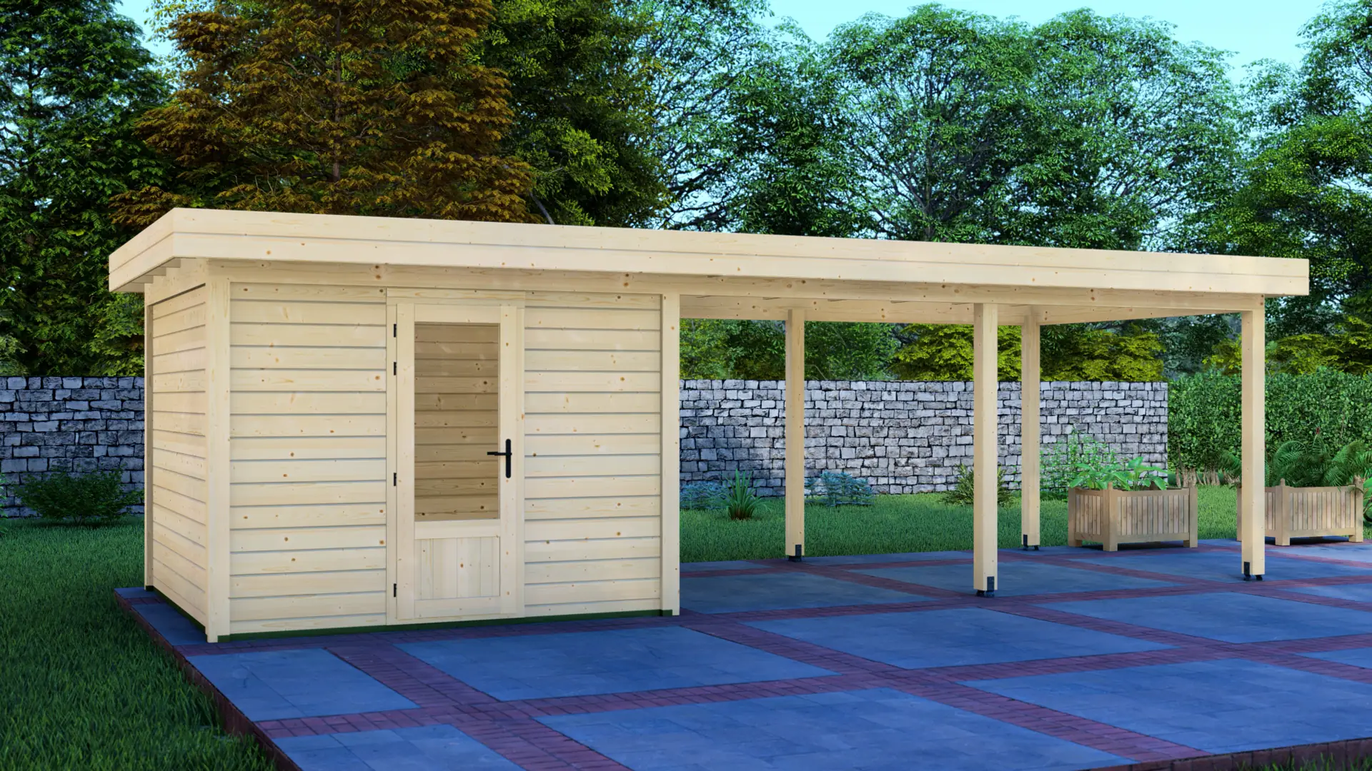 9m² koka mājiņa, ko papildina lielāka 15m² nojume, aicinot vairāk laika pavadīt svaigā gaisā.