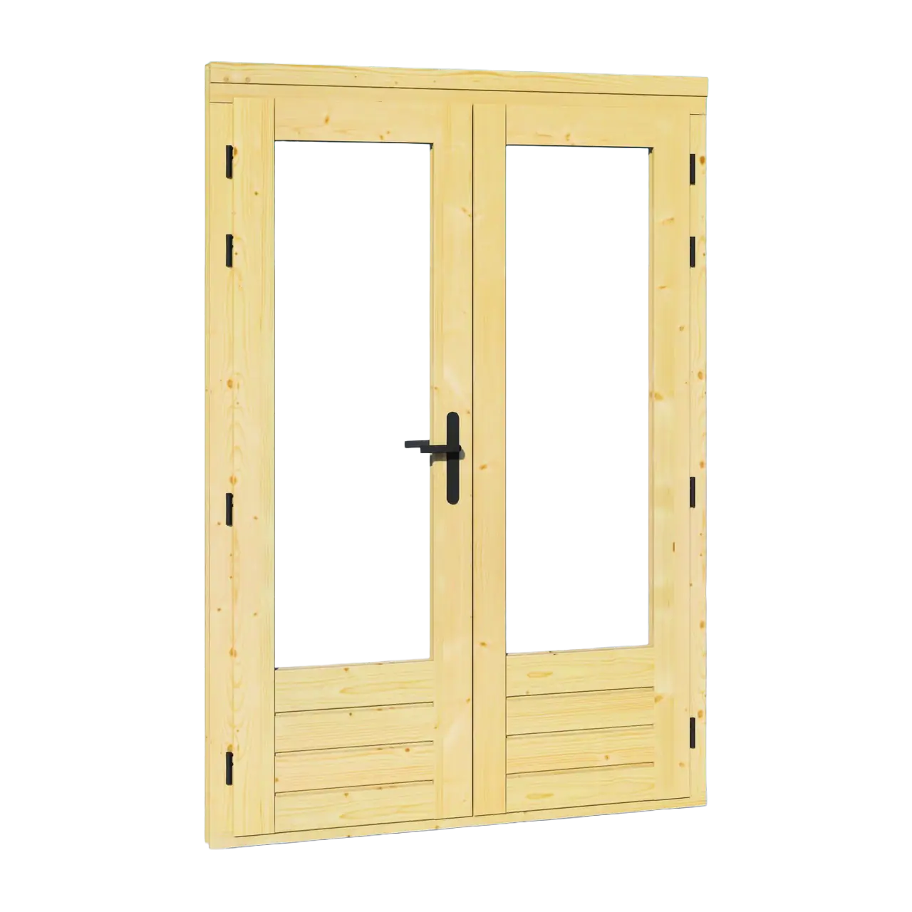 Vienviru, uz āru atveramas durvis, 886×1918 mm. Izgatavotas no 45 mm laminētas egles koksnes un dubultstikla ESG. Ideāli piemērotas koka dārza ēkām.